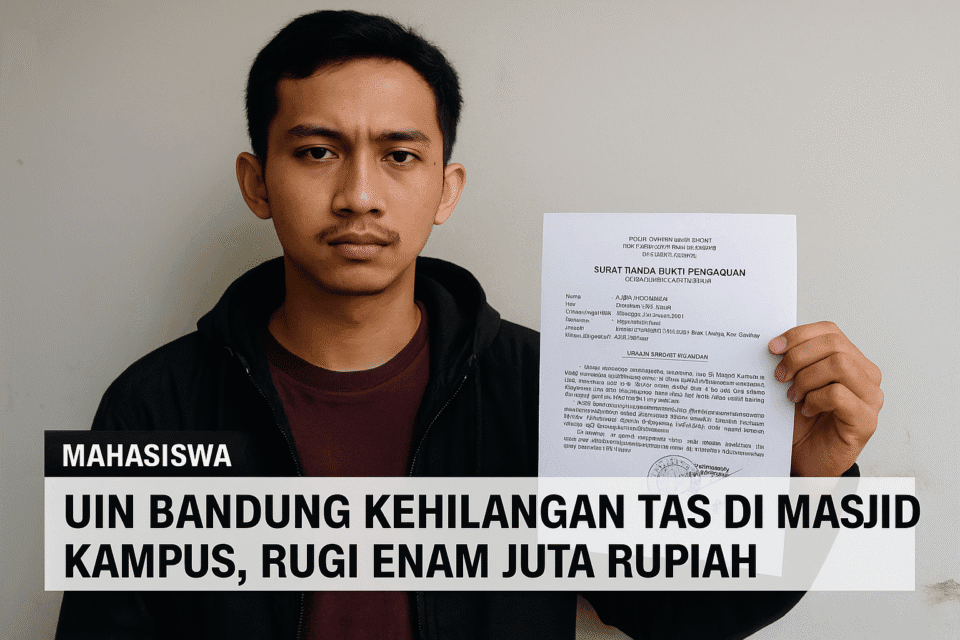 Bandung, Info Burinyay – Seorang mahasiswa Universitas Islam Negeri Sunan Gunung Djati Bandung, Alwi Ardiansah, menjadi korban pencurian saat salat Ashar di Masjid Kampus II UIN, Kelurahan Cimincrang, Kecamatan Gedebage, Kota Bandung, pada Selasa, 6 Mei 2025.