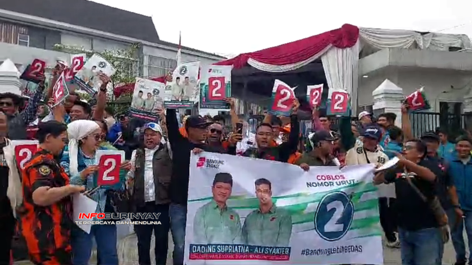 Soreang, Info Burinyay – Komisi Pemilihan Umum (KPU) Kabupaten Bandung menggelar rapat pleno terbuka untuk mengundi dan menetapkan nomor urut pasangan calon (paslon) Bupati dan Wakil Bupati Pilkada 2024, Senin 23 September 2024. Acara tersebut berlangsung di halaman Kantor KPU Kabupaten Bandung, Jalan Bhayangkara No. 34, Soreang. Ratusan pendukung dari kedua paslon hadir dengan antusias.