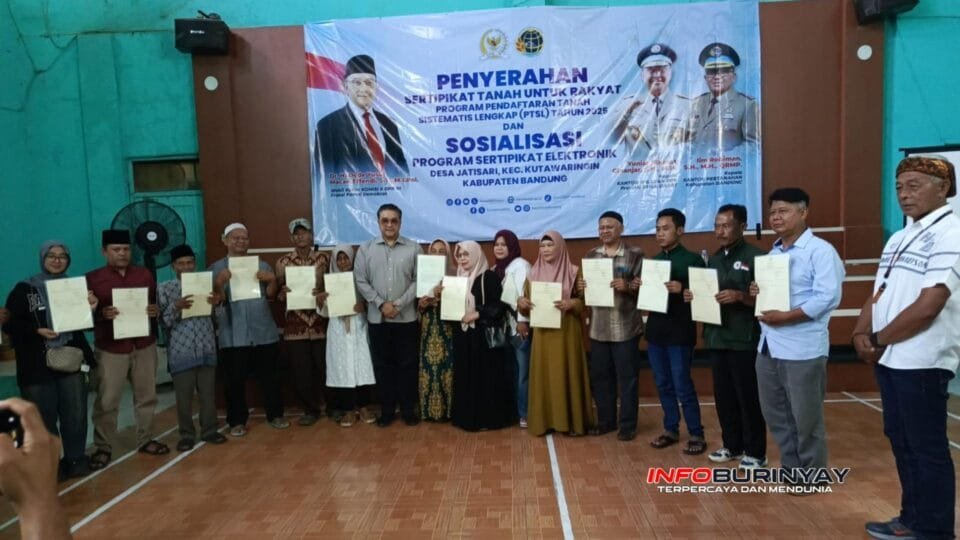 Kutawaringin, Info Burinyay – Kantor Agraria dan Tata Ruang/Badan Pertanahan Nasional (ATR/BPN) Kabupaten Bandung kembali menegaskan komitmennya dalam mempercepat legalisasi aset tanah masyarakat. Melalui Program Pendaftaran Tanah Sistematis Lengkap (PTSL), BPN menyerahkan 112 sertifikat tanah elektronik kepada warga Desa Jatisari, Kecamatan Kutawaringin, pada Sabtu (11/10/2025).