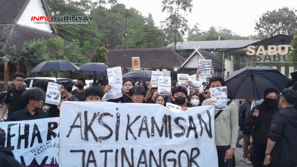 Jatinangor, Info Burinyay – Puluhan mahasiswa Universitas Padjadjaran (Unpad) dan tokoh pemuda Jatinangor menggelar aksi damai di depan Gedung Sabusu, Desa Sayang, Kecamatan Jatinangor, Kamis (26/6). Mereka tergabung dalam gerakan Aksi Kamisan Jatinangor. Aksi ini rutin berlangsung setiap hari Kamis sebagai bentuk kritik terhadap ketimpangan sosial dan pelanggaran HAM.